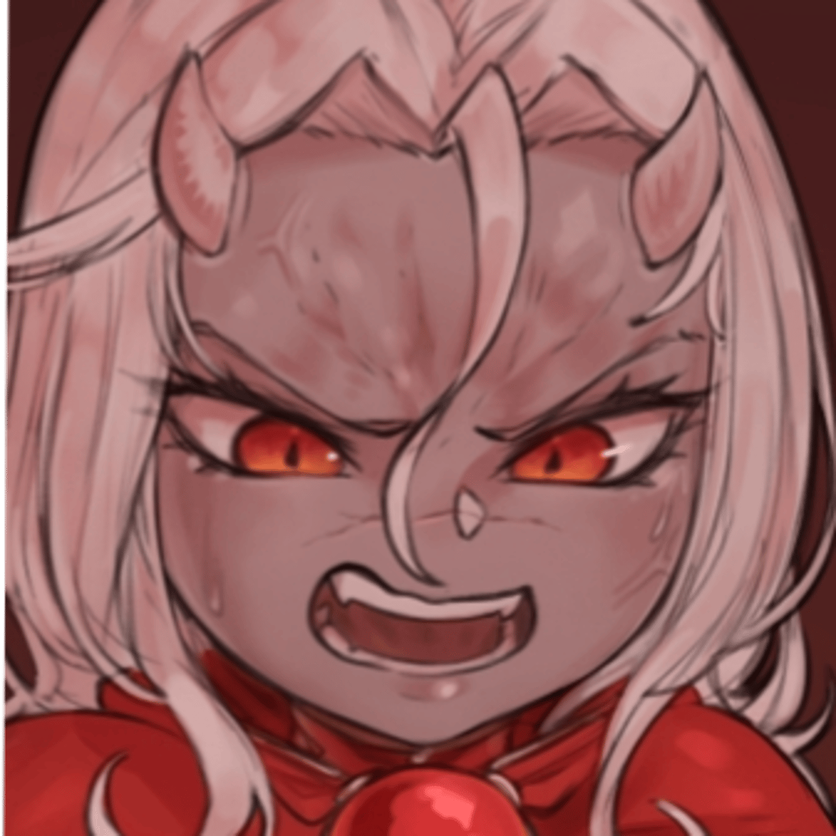 She a grey-skinned azafurean human with two short horns, light grey hair, and orange eyes. She wears a red robe with what appears to be gold, or perhaps a sort of auric metal, on parts of her outfit, and brown pants.