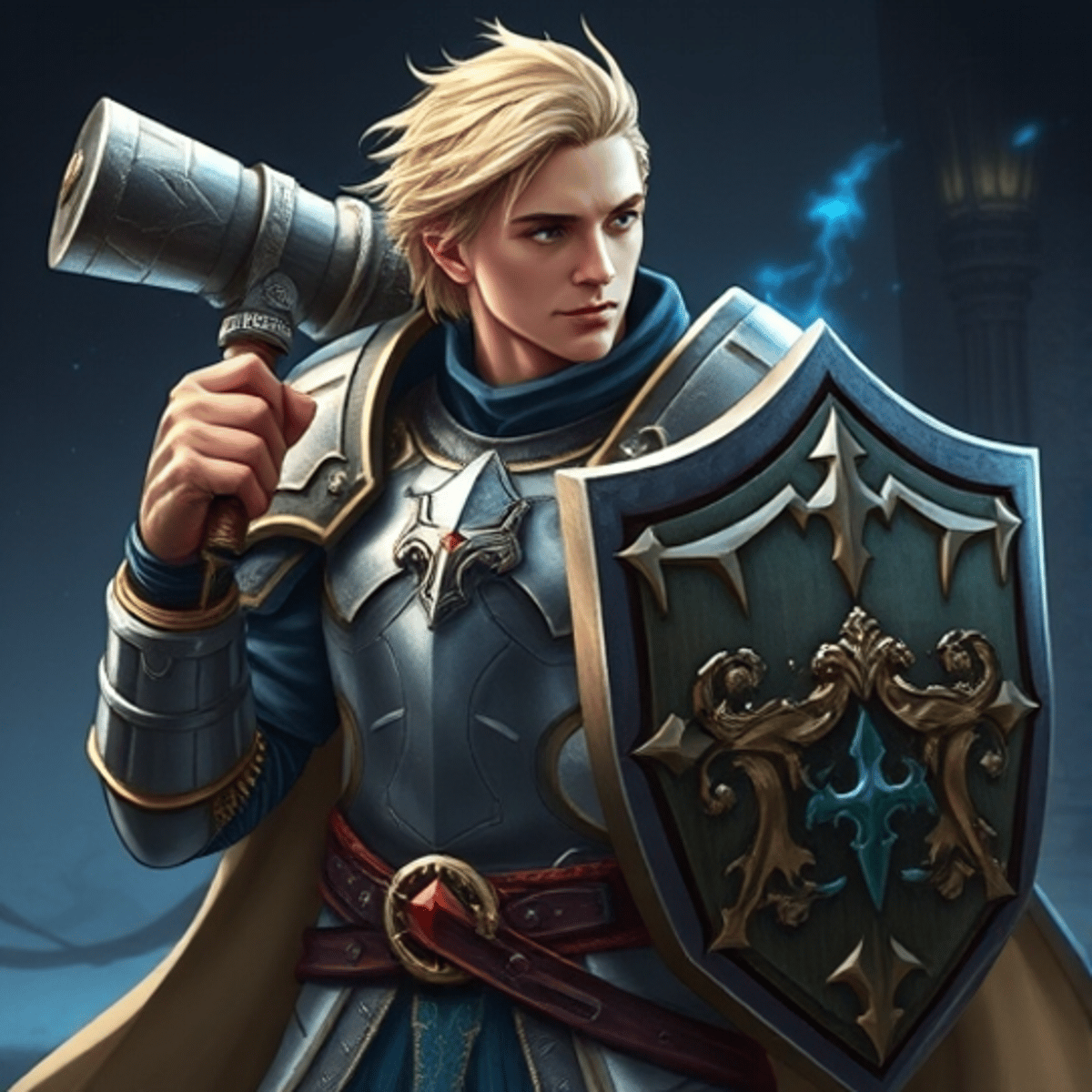 Aedrix Tempest is the embodiment of noble might and unwavering faith. Born as the only son of Queen Laenna Ciro and King Argon Tempest, he grew up in the opulent but demanding court of the Kingdom of Vesperia. With striking blonde hair and vibrant blue eyes, he's imposing in full plate armour.