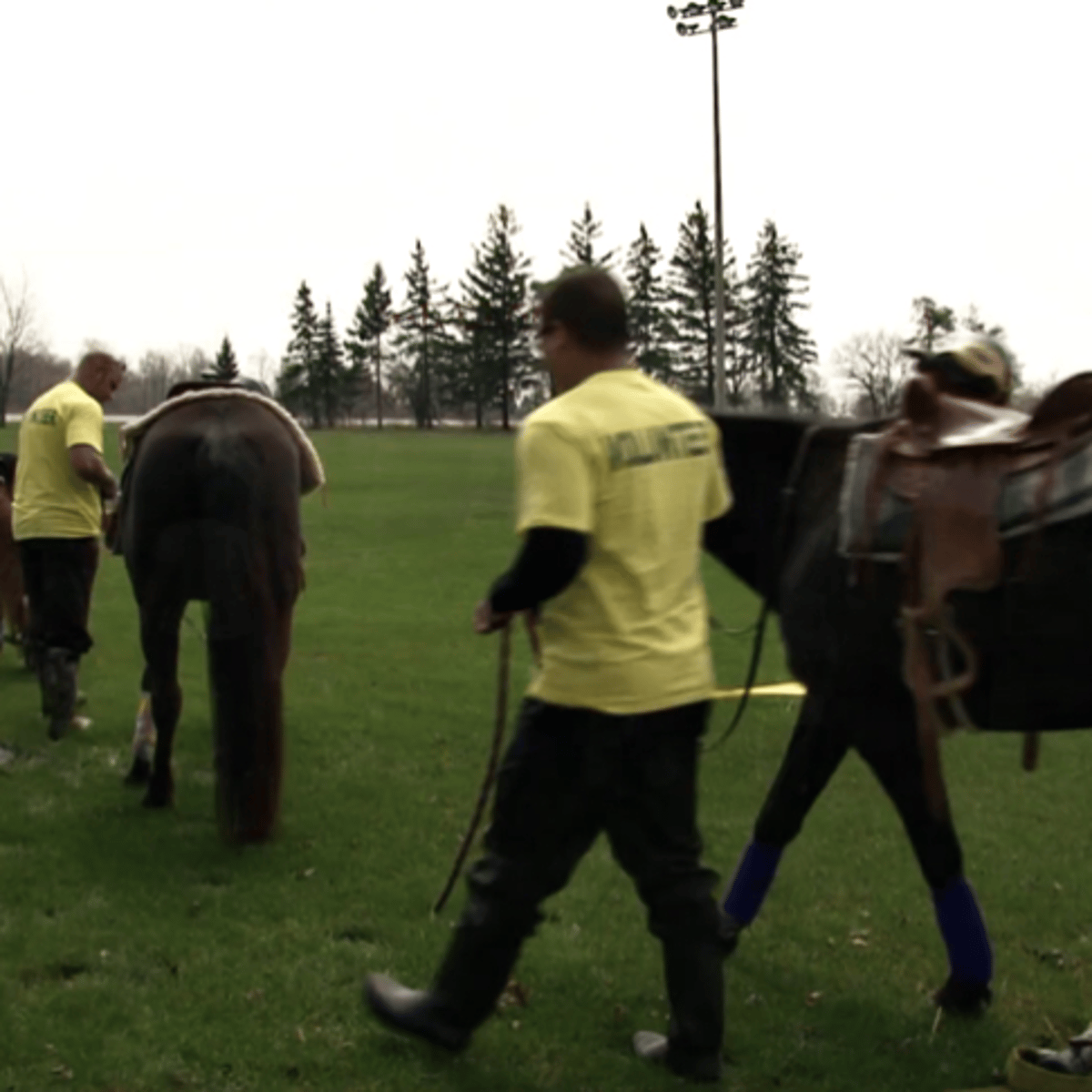 He a volunteer for the national puddle day in Hamilton Ontario wearing his yellow t shirt black long shirt black jeans and black rubber boots with green soles