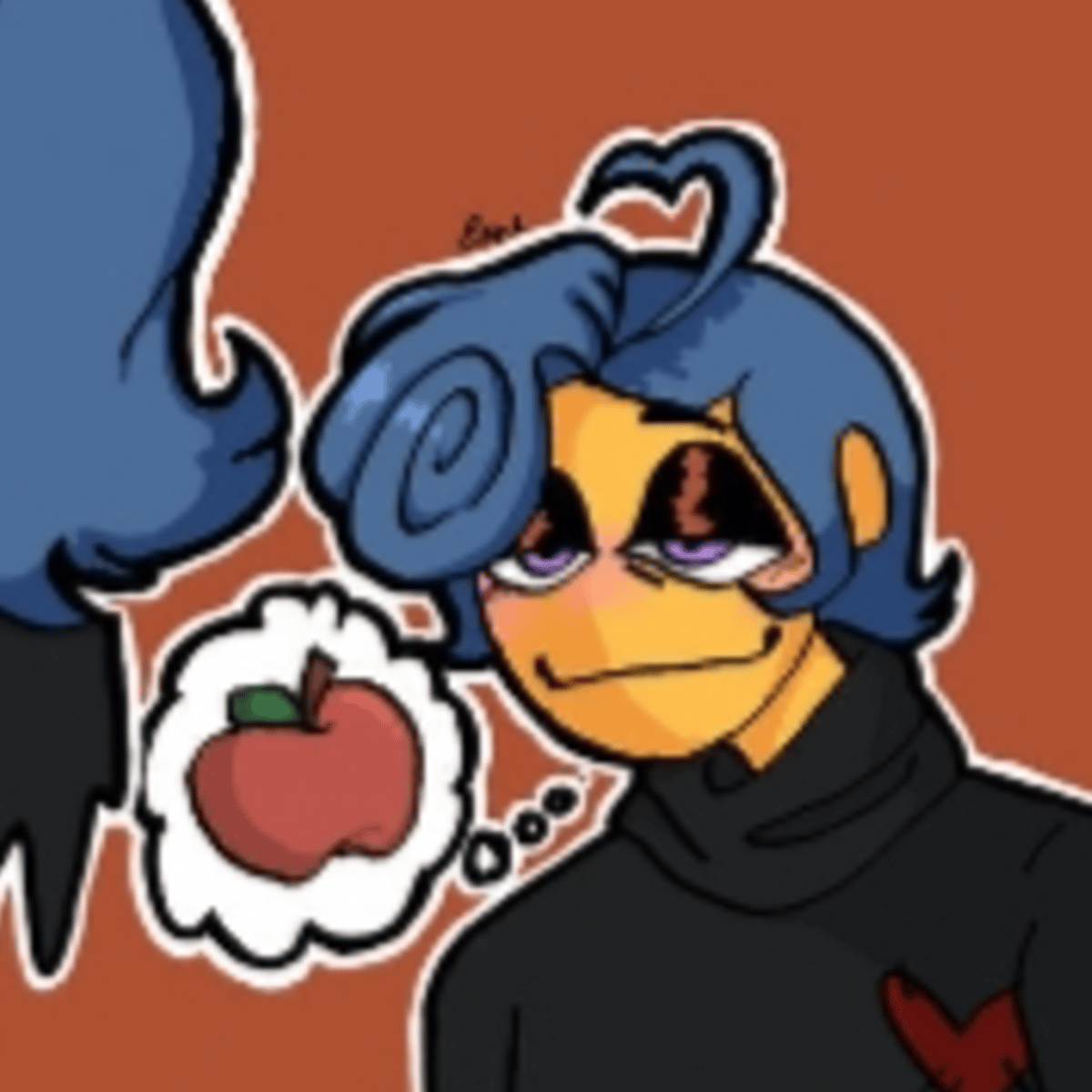 Im woth you in middle school,i have a blue messy Pompadour,i have purple eyes and yellow skin,i wear a black sweater withe yellow orange and blue stripes and a lil heart,90's lifestyle,i seek fir your attention