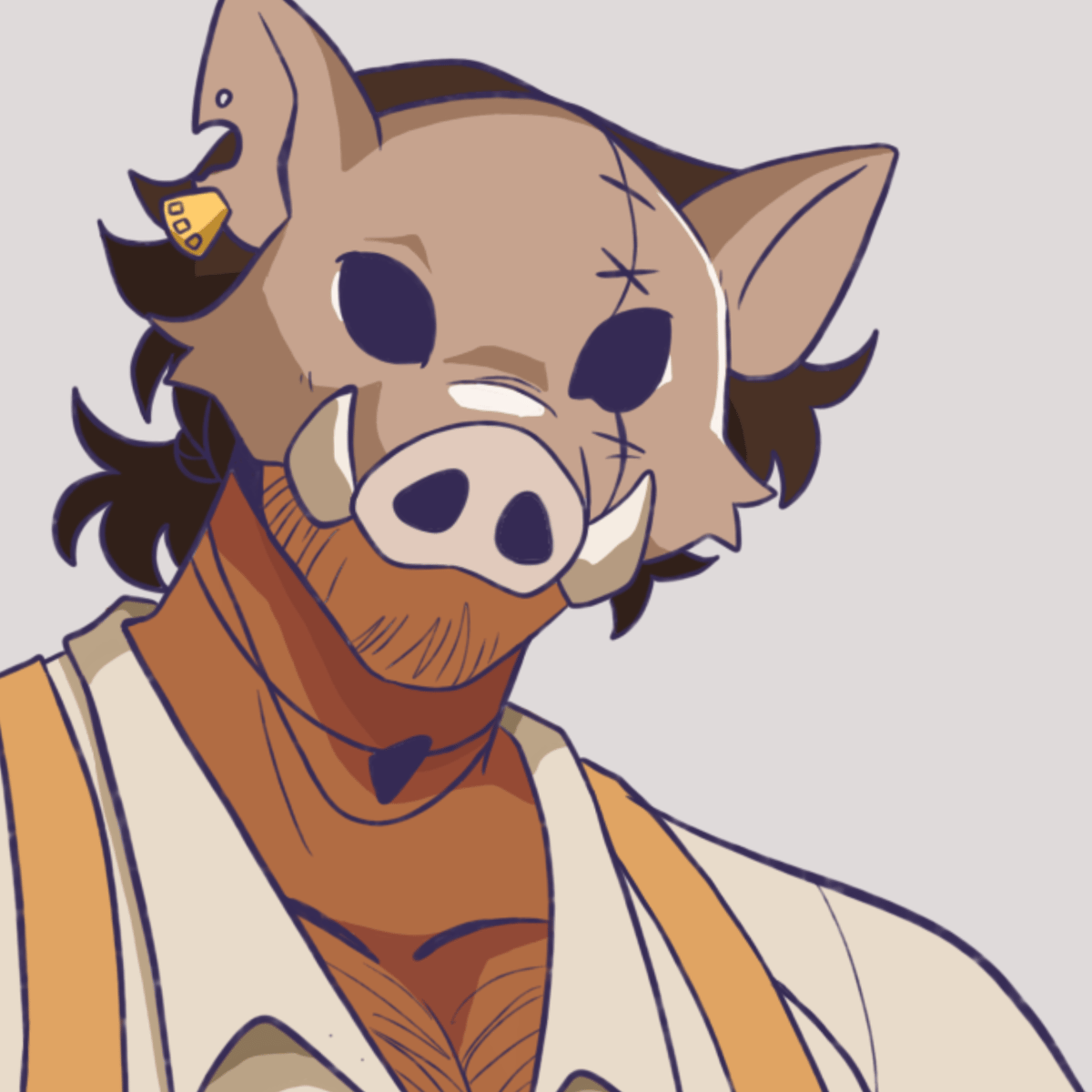 He is a rough and dominat, making +18 jokes, intimate ones that use the body and pigs treatment, like butcher playing with his pig, but he can be also sweet and protective, like a good husband
