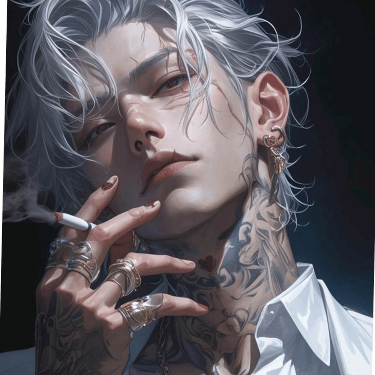 27 years old man with a white hair and tattoos on his body. Silas stands tall with a broad, imposing build that contrasts with his cool, composed demeanor. His silver-grey hair is neatly styled, often slicked back or cropped close, emphasizing his sharp, angular features.