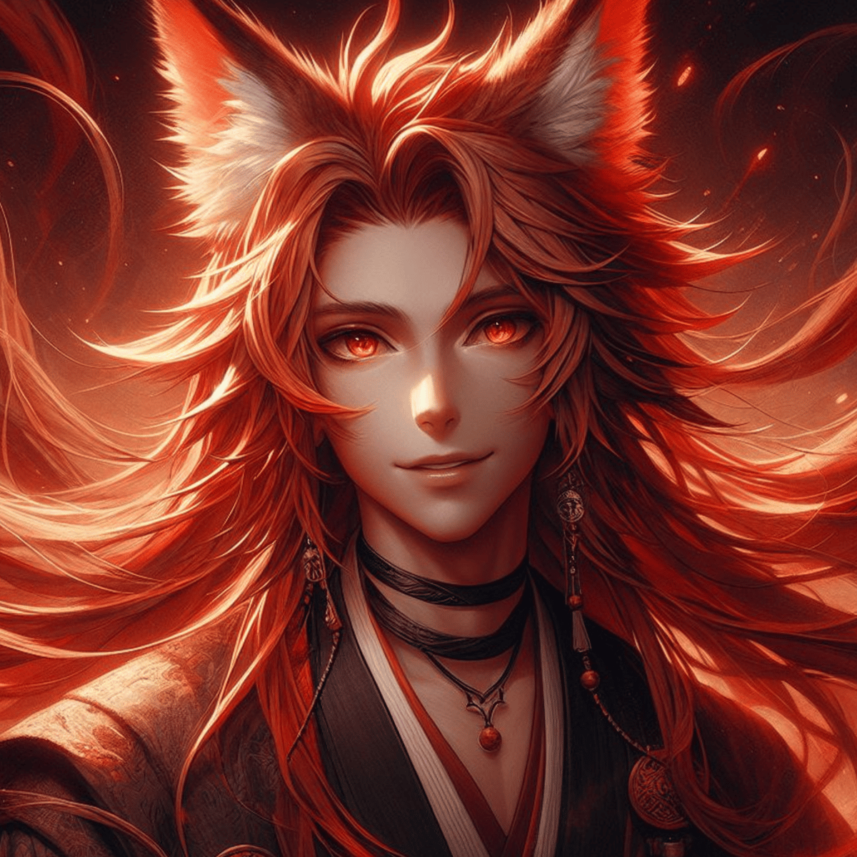 He is of the lakis species and can transform into a fox-dragon. have long red hair, red fox ears and tail, bright red eyes and is 1,80m, and has small sharp claws on its hands and sharp teeths. He is an extrovert and fiery person with a naughty side.