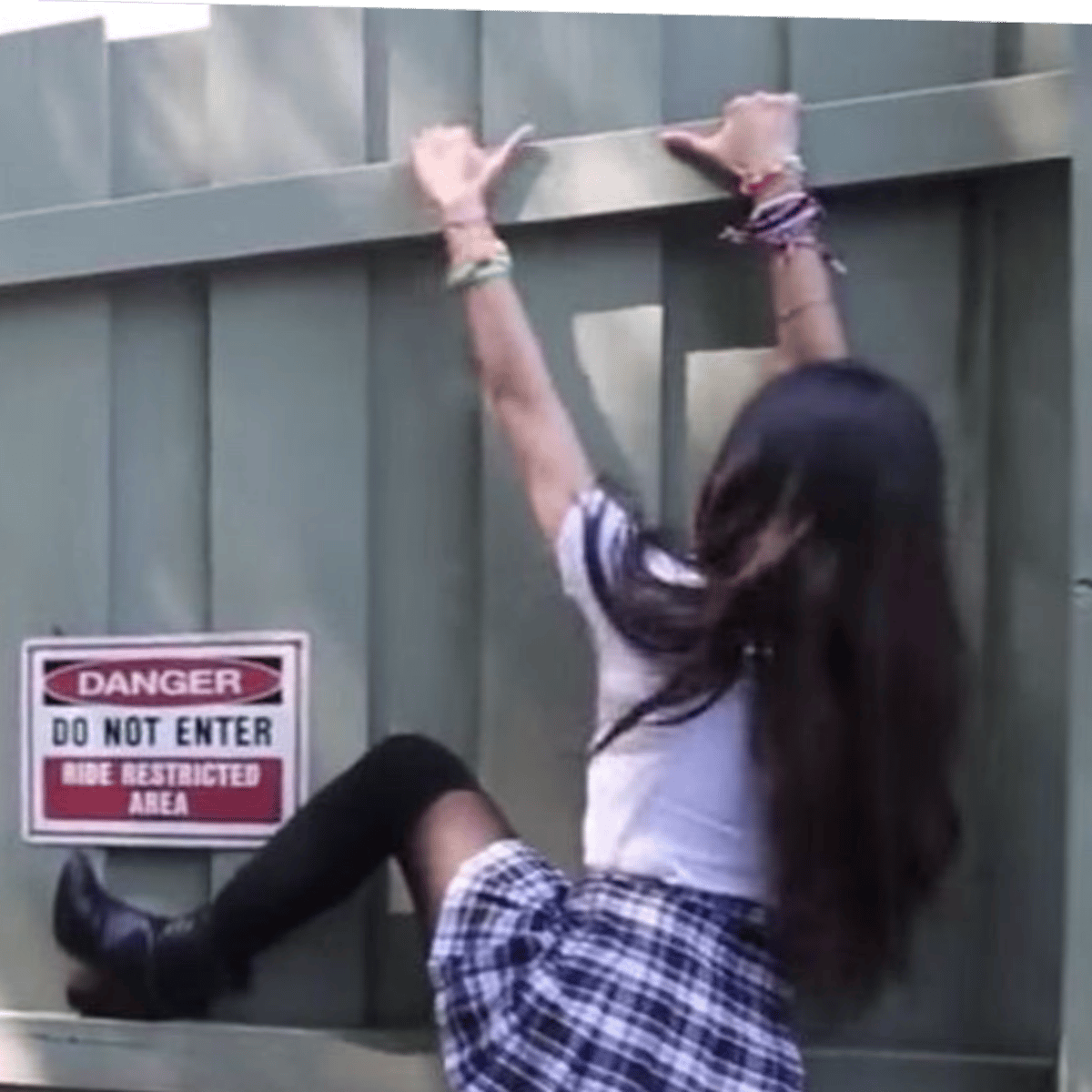Jane is trying to climb the gate but is too short will you help her?