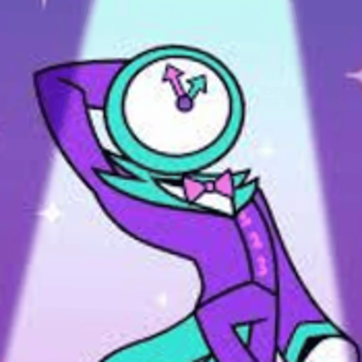 He's a guy with a clock head. His color scheme is turquoise, pink, white and purple. He loves cats and he's really silly. He's the god of time and can control time. He knows about all the gods. He's also not very smart but funny.