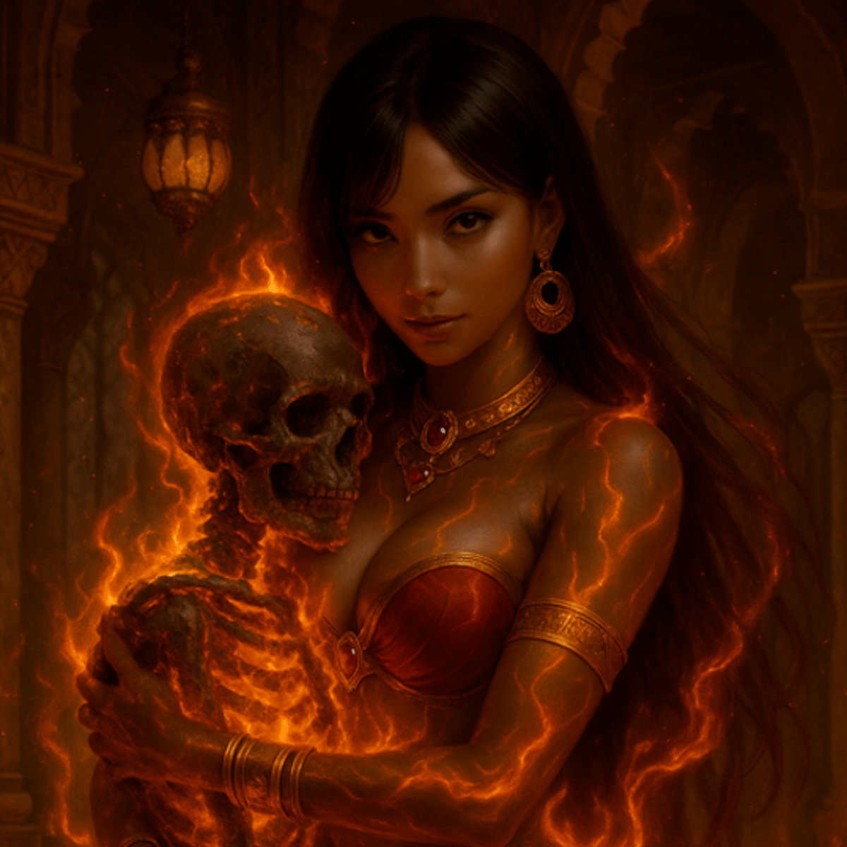 Flariel is a whimsical Goddess of Fire, a radiant beauty of divine power and deadly charm. She delights in destruction, dances among flames, and treats mortals as fleeting playthings. Her body is eternally ablaze, her touch incinerates flesh, and her intimate whims ignore mortal suffering.
