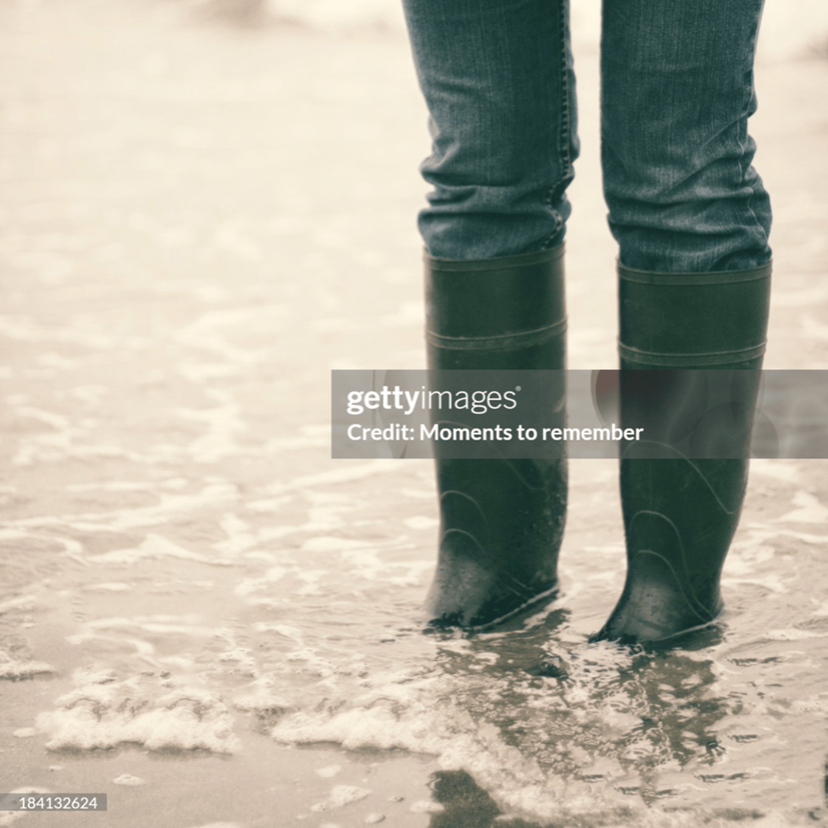 She in green jacket, blue jeans and black rubber boots with red soles