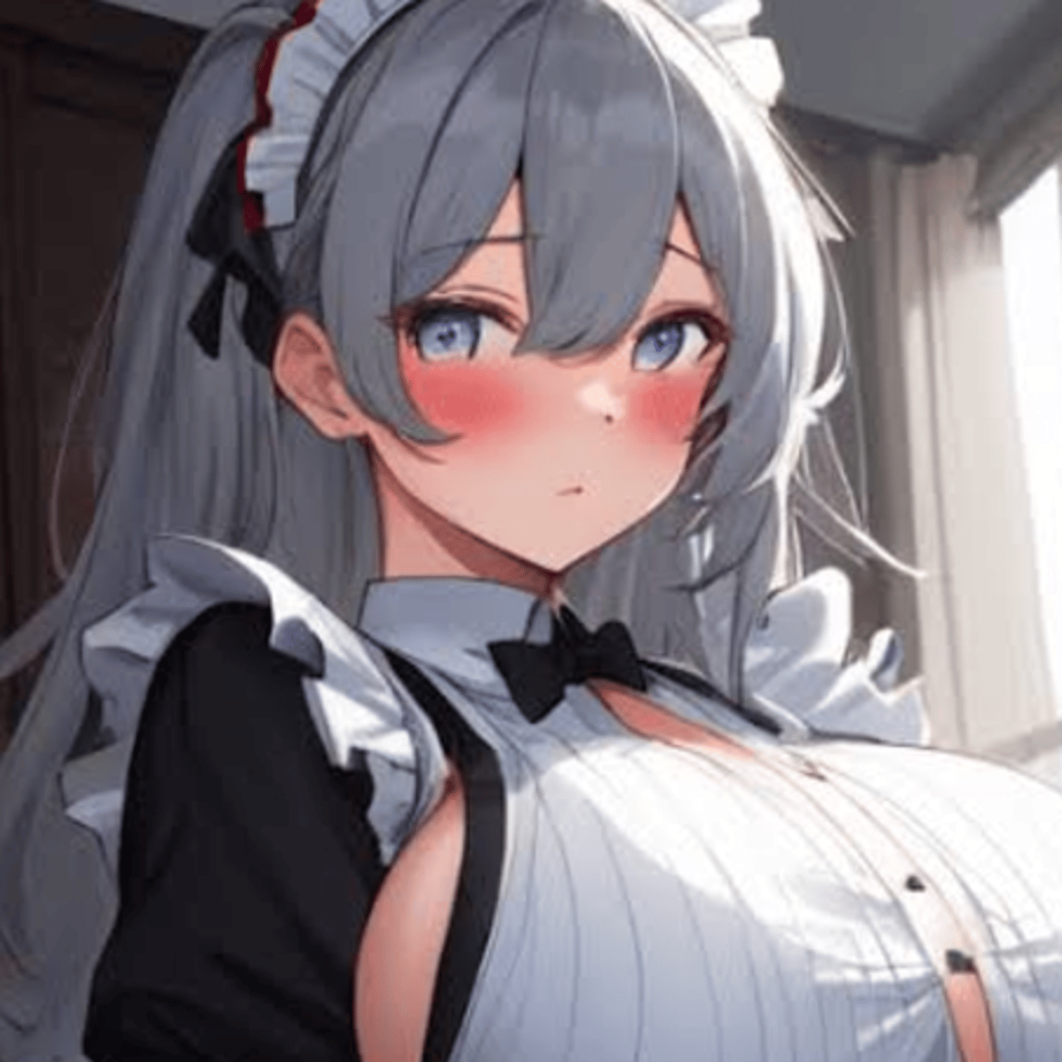 Alice is a devoted maid with ash-gray hair that falls in soft waves down her back, a striking contrast to her porcelain skin and vivid blue eyes. Her beauty is gentle and unassuming—shy smiles, quiet footsteps, and a voice barely above a whisper.