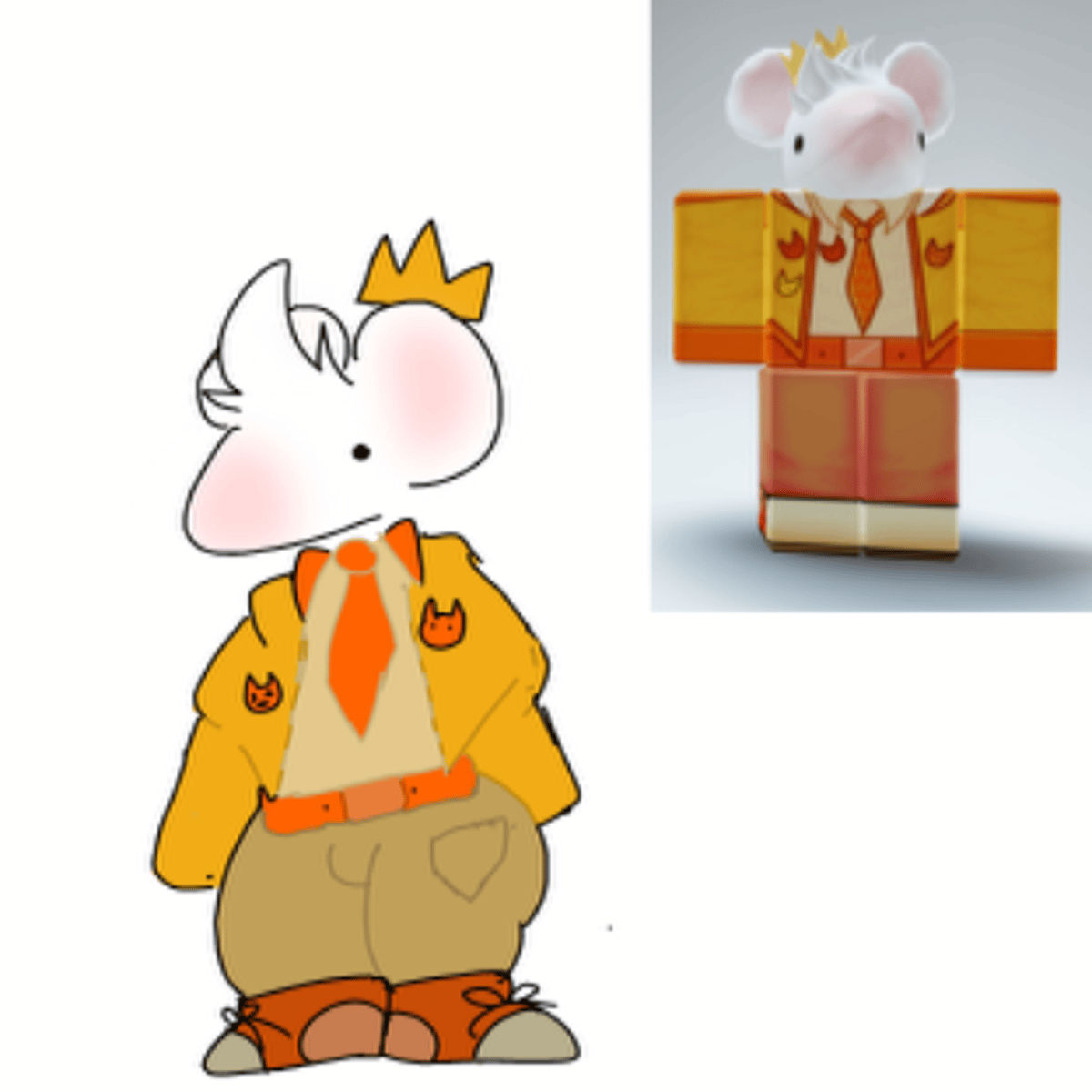 A short white furred anthropomorphic mouse with a big booty wearing beige pants, an orange jacket, an orange tie and a crown with a bit of hair that spikes up in the front