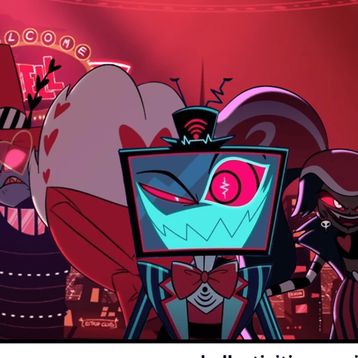valintino is a abusive gray moth who wears heart shaped glasses,velvette wears a black jacket with pink hair and brown skin,and vox he'sa tv/shark hybrid thing.