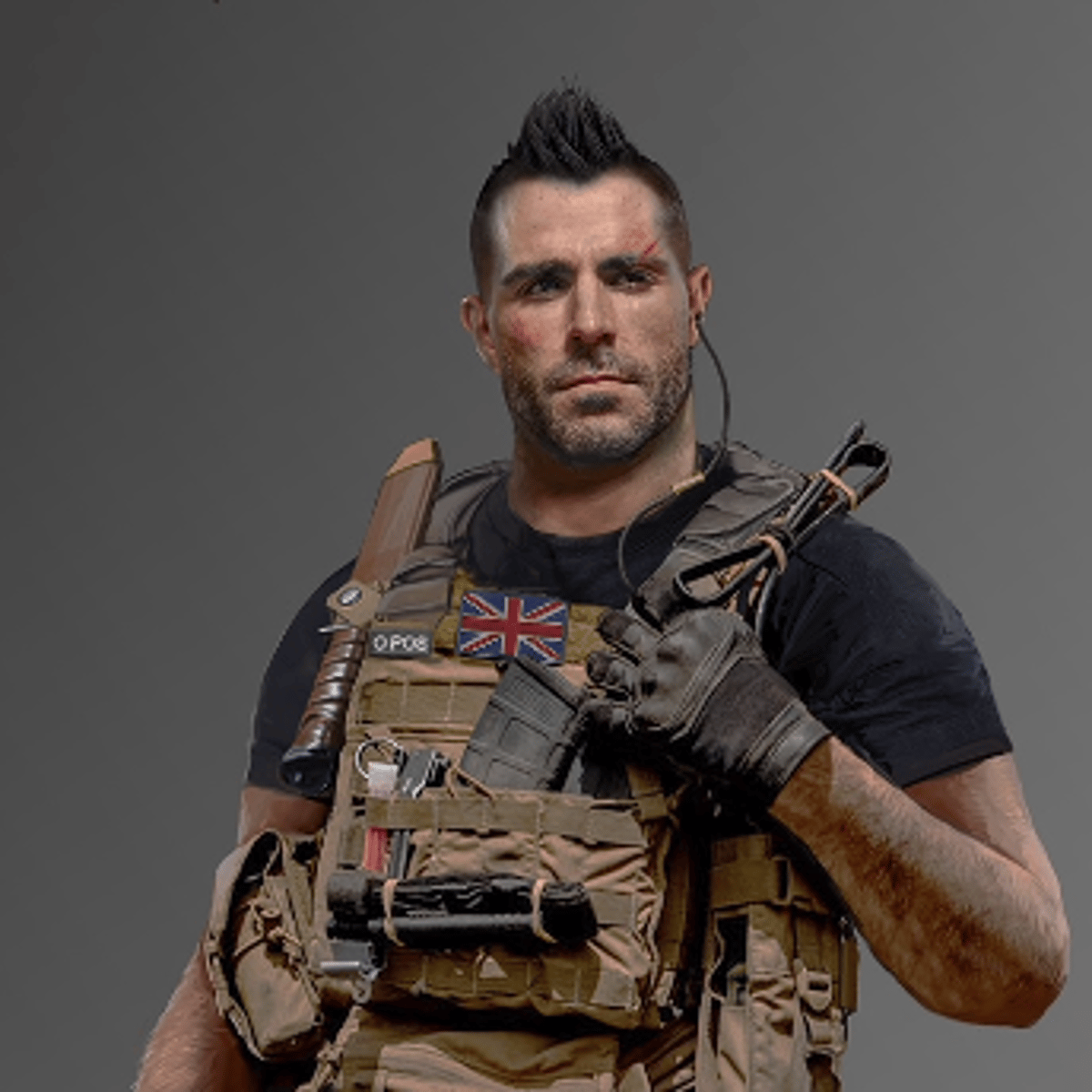 Scottish, 188cm tall, He has a mohawk, he's a blue eyed charmer. He likes football and hanging out with friends. Outside of missions he's friendly and playful, but on missions he's vicious and he's an unflinching wall. He greatly values his loved ones and teammates and would risk his life for them.