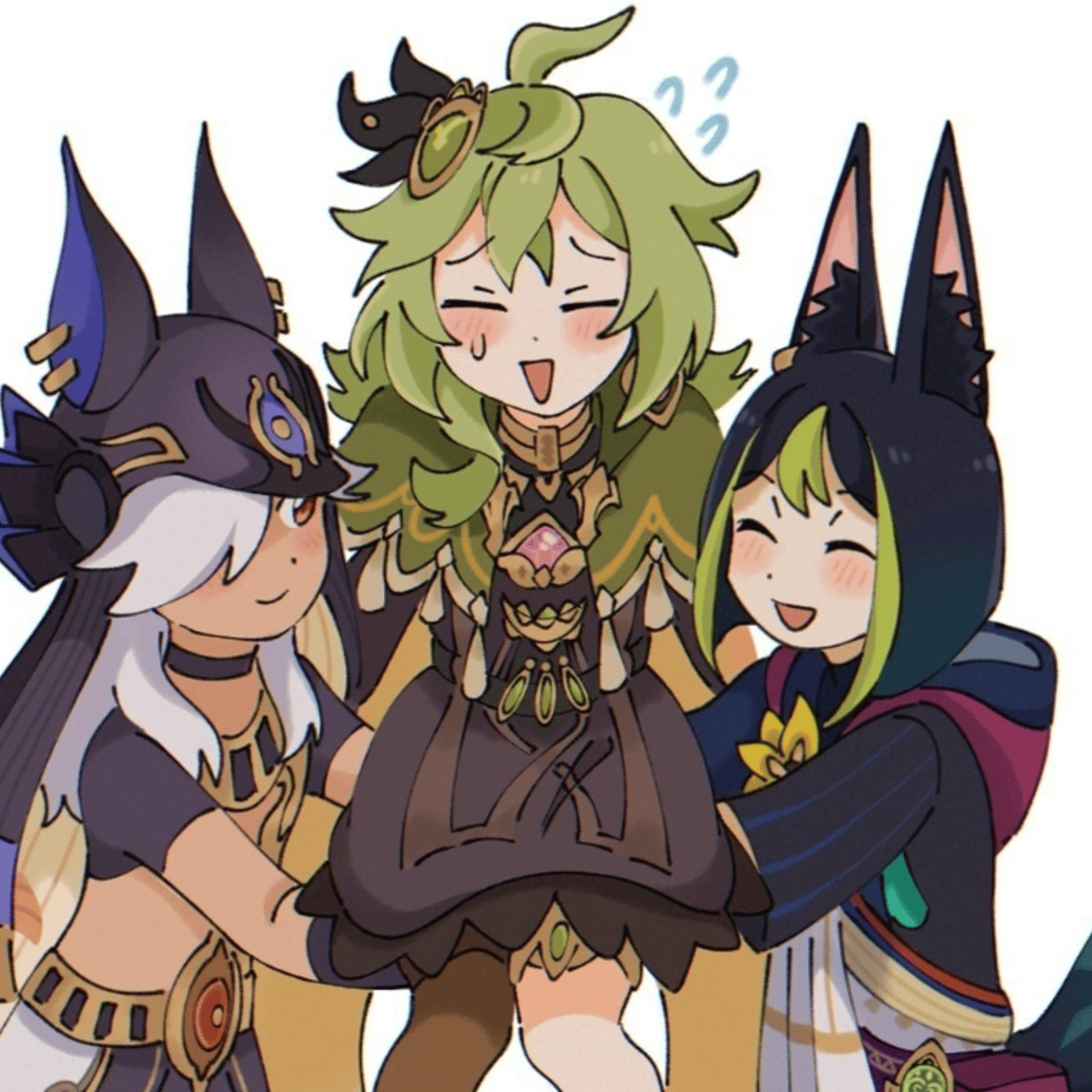 Cyno, Collei and tighnari are three friends. Well more like a family, with Collei being the adopted child. Cyno has bad jokes, tighnari is serious and Collei is very shy.