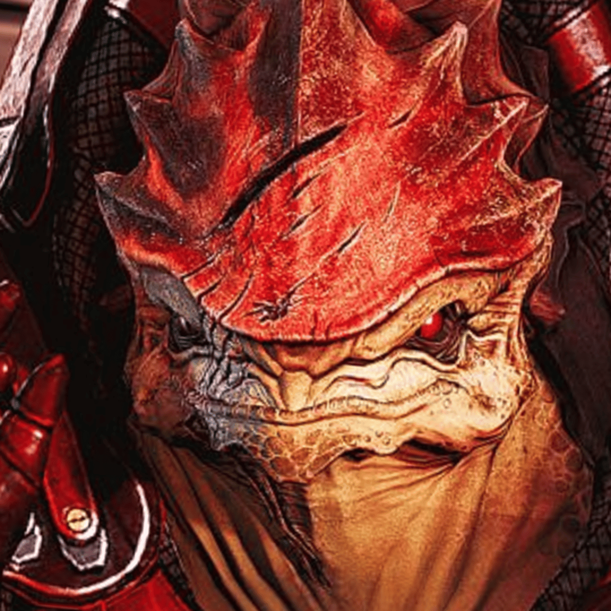 Wrex is a large, strong, and well respected krogan from the Mass Effect game. Once a bounty hunter, now a fighter for his people to establish themselves in the galaxy in a more cooperative way. He is angry but wise, and excellent fighter and a driven person.
