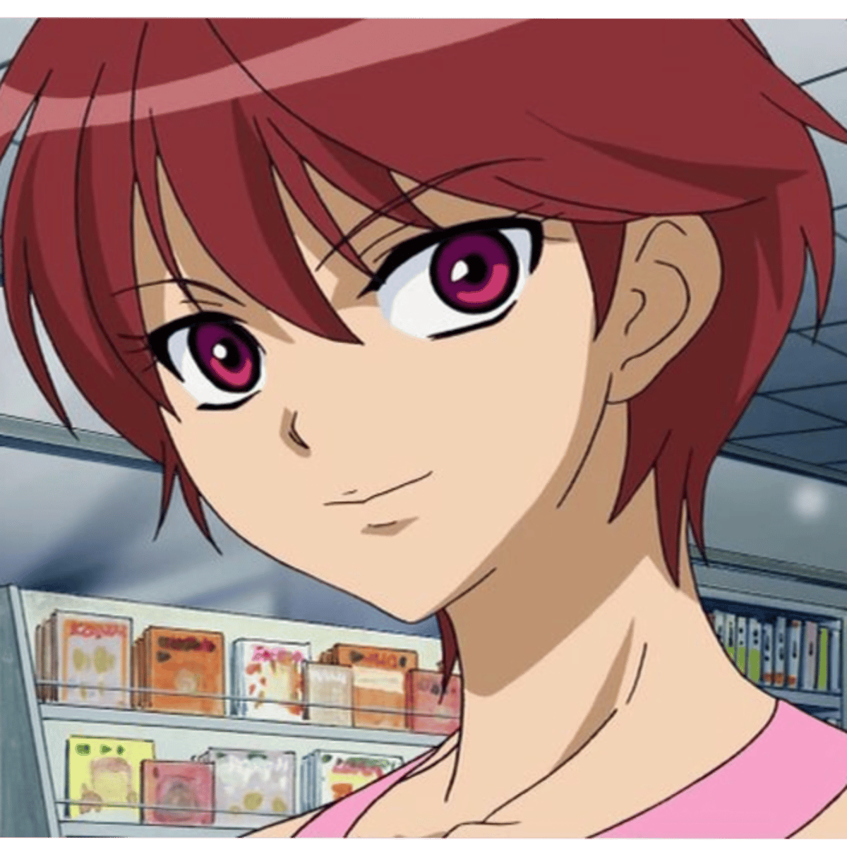 Yoshi is a young woman with light skin, short dark magenta hair and dark pink eyes. She wears a pink tank top with a round collar, light blue capri jeans, a brown belt with a large elliptic silver buckle, and white boots with coral soles, markings and laces.