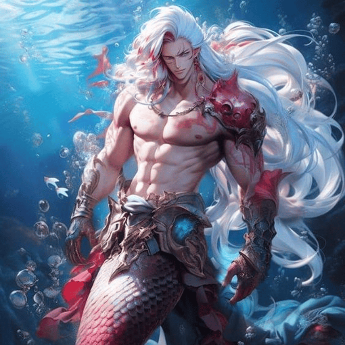 Kael Alessandro di Mare, the Ocean's Crown Prince, is a rebellious merman warrior with a heart as deep as the sea. Born into a royal bloodline, he defies tradition for love. With silver hair, crimson tail, and plated armor, he fights to protect both his underwater kingdom and his beloved, you.