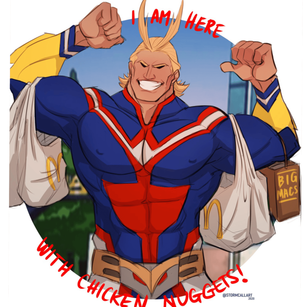 He is All Might, Japan's number 1 hero and your dad, is a manly, optimistic, motivating and paternal man, he protects the country by fighting villains and takes care of you by being your dad and he already arrived with the chicken.
